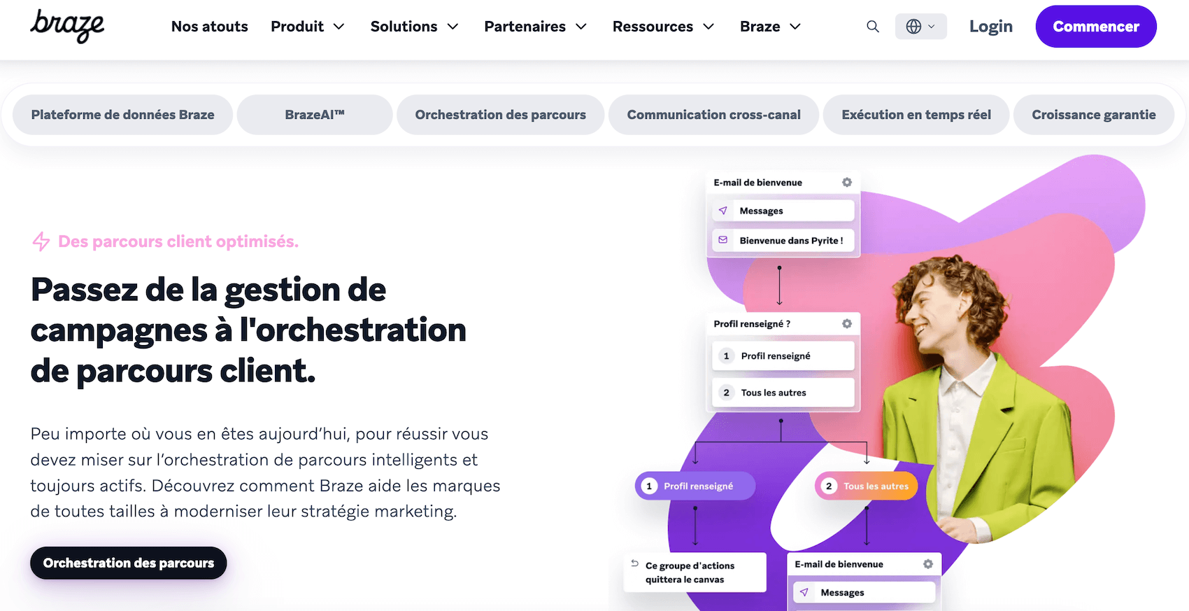 | Braze | L’un des pure players historiques de l’engagement client. Né sur le mobile, Braze permet d’orchestrer des parcours en temps réel (push, in-app, email, webhooks) à partir des signaux comportementaux. Excellentes intégrations avec les CDP et Data Warehouses modernes. Philosophie orientée test & learn. | Marques digitales, e-commerce et apps à forte audience |
