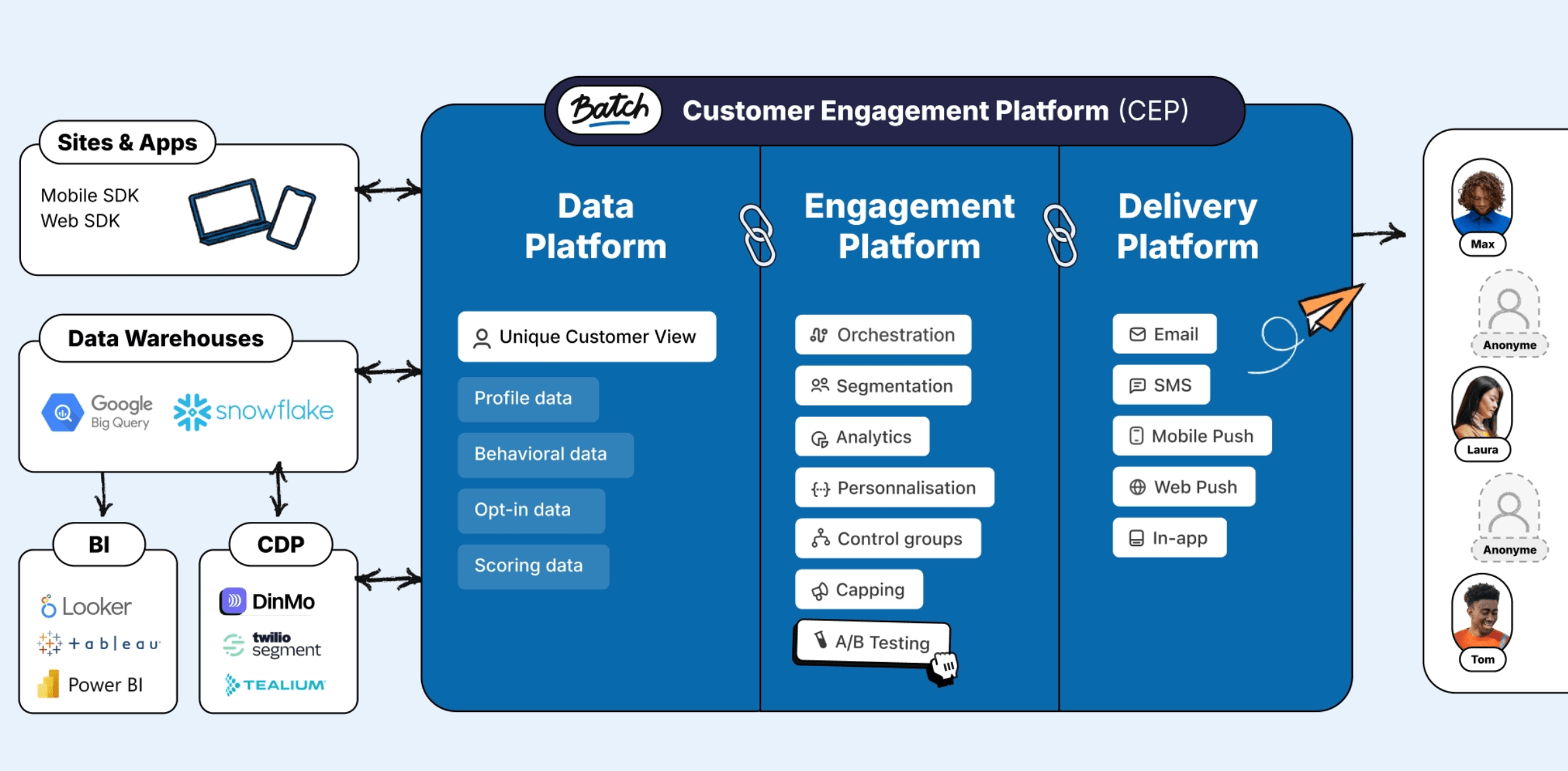 Une CEP, en résumé, c’est une plateforme marketing omnicanale qui intègre en elle-même un référentiel de données et audiences marketing (alimenté par un Data Warehouse ou une CDP).