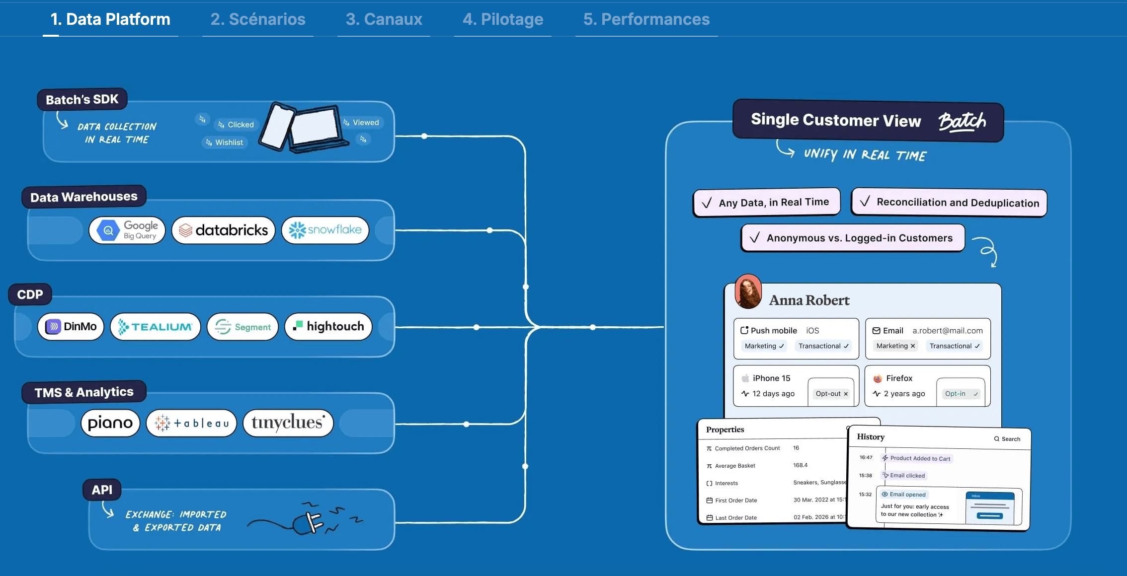 - Un socle de données client. Une Customer Engagement Platform centralise les informations issues de vos différentes sources (votre CRM, votre site web, votre application mobile, vos points de vente, votre service client, etc.) pour construire une vision unifiée de chaque client. On parle de « référentiel marketing » ou de “Vision client 360”. Si vous avez déjà travaillé sur un projet de Référentiel Client Unique (RCU), vous voyez de quoi il s’agit.
