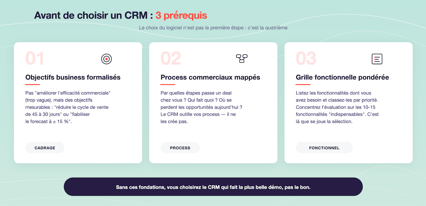 Si ces prérequis ne sont pas remplis, toute sélection sera biaisée. Vous comparerez des outils sans savoir ce que vous cherchez et vous finirez peut-être par choisir le CRM qui fait la plus belle démo, pas celui qui correspond à votre réalité.