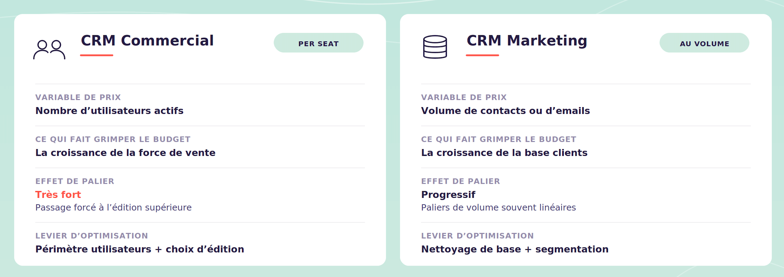 C’est la différence fondamentale avec le CRM Marketing, qui est facturé au volume de contacts en base ou au volume d’emails envoyés. Vous pouvez passer de 50 000 à 500 000 contacts sans changer d’ordre de grandeur sur la variable prix. Avec un CRM Commercial, impossible d’absorber le doublement d’une équipe commerciale sans impact budgétaire.