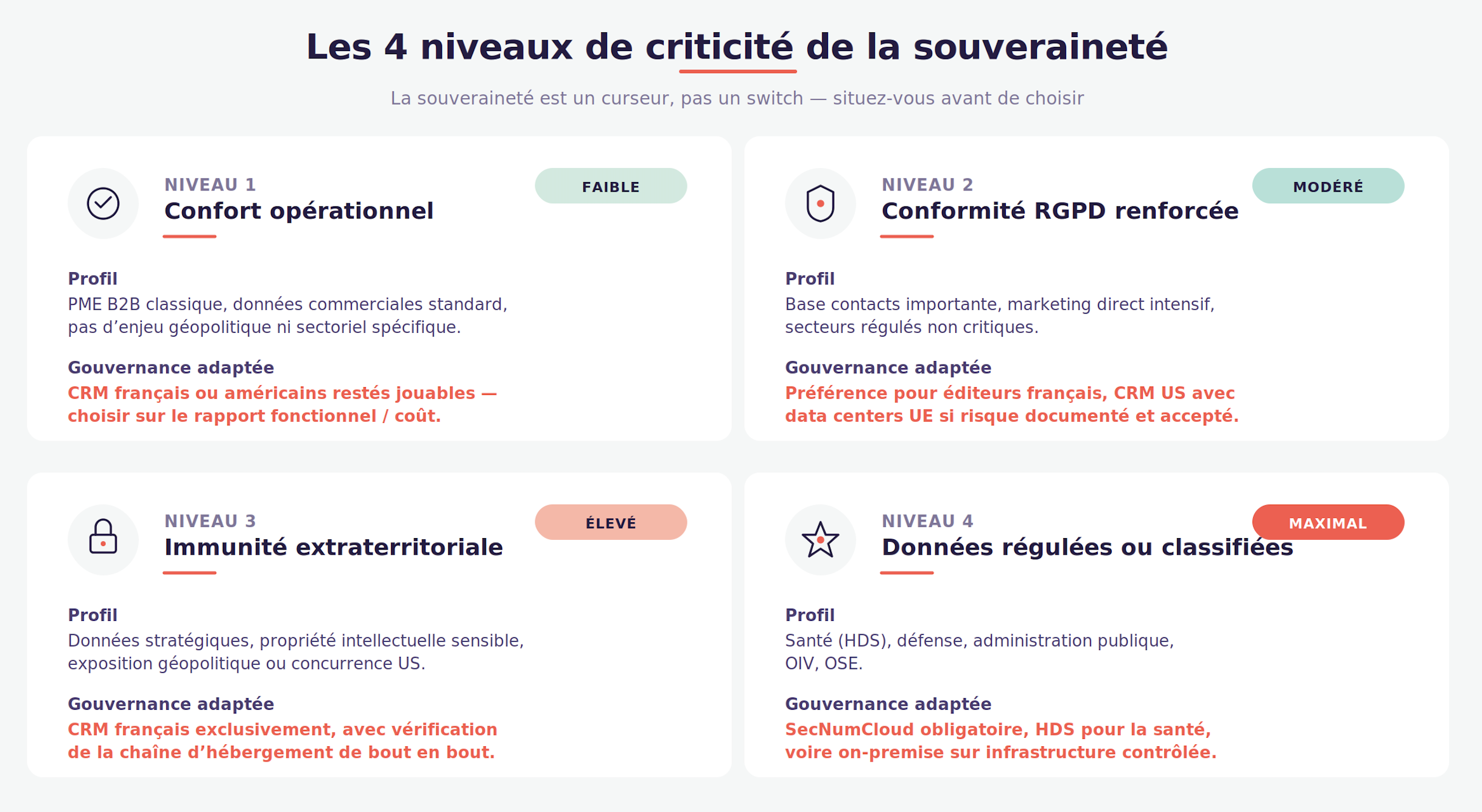 - La souveraineté n’est pas un choix binaire, c’est un curseur à quatre niveaux. Selon votre exposition réelle aux données sensibles, votre secteur, votre clientèle, votre contexte géopolitique, vous vous situez sur l’un de ces niveaux. Cette qualification doit précéder le choix de l’outil. Sauter cette étape, c’est se condamner soit à sur-investir dans une souveraineté qui n’apporte rien, soit à sous-estimer un risque qui peut devenir critique.